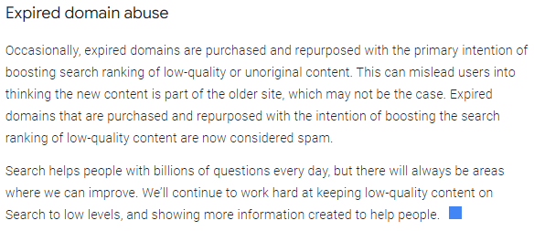 때때로 만료된 도메인이 구매되어 저품질 또는 오리지널이 아닌 콘텐츠의 검색 순위를 높이는 주요 목적으로 재사용됩니다. 이로 인해 사용자는 새로운 콘텐츠가 이전 사이트의 일부라고 착각할 수 있지만 그렇지 않을 수 있습니다. 저품질 콘텐츠 검색 순위를 높일 목적으로 구입 및 재사용된 만료 도메인은 현재 스팸으로 간주됩니다.