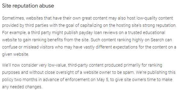여기에서는 주로 랭킹 목적으로 제작된 매우 가치가 낮은 제3자의 콘텐츠를 웹사이트 소유자의 엄격한 감시 없이 스팸으로 간주합니다. 5월 5일 시행 두 달 전에 이 정책을 공개하여 사이트 소유자에게 필요한 변경을 할 시간을 줍니다.