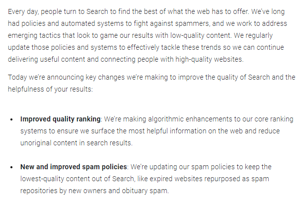 품질 순위 향상: 우리는 웹상에서 가장 유용한 정보를 확실하게 표면화하고 검색 결과의 오리지널이 아닌 콘텐츠를 줄이기 위해 핵심 순위 시스템을 알고리즘적으로 강화하고 있습니다.