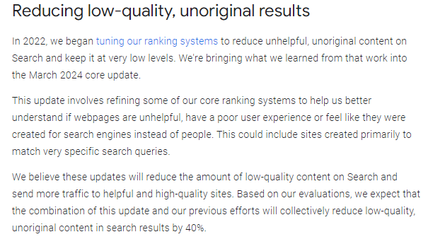 2022년에 우리는 검색에 도움이 되지 않는 독창적이지 않은 콘텐츠를 줄이고 매우 낮은 수준으로 유지하기 위해 랭킹 시스템을 조정하기 시작했습니다. 우리는 이 연구에서 배운 것을 2024년 3월 핵심 업데이트에 도입하고 있습니다.