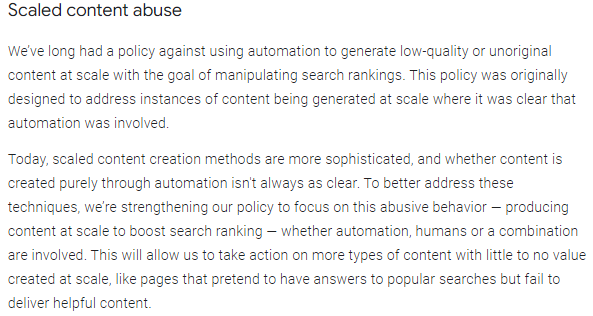 우리는 오랫동안 검색 순위를 조작할 목적으로 저품질 또는 독창적이지 않은 콘텐츠를 스케일로 생성하기 위해 자동화를 사용하는 것에 반대해 왔습니다. 이 정책은 원래 자동화가 관여하고 있는 것이 분명한 규모로 콘텐츠가 생성되는 인스턴스에 대처하도록 설계되었습니다.