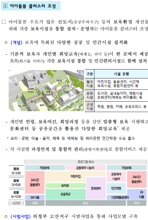 이 외에도 아이돌봄 클러스터를 조성해 보육에 특화된 공공 및 민간시설을 집적화 하겠다고 발표했습니다.