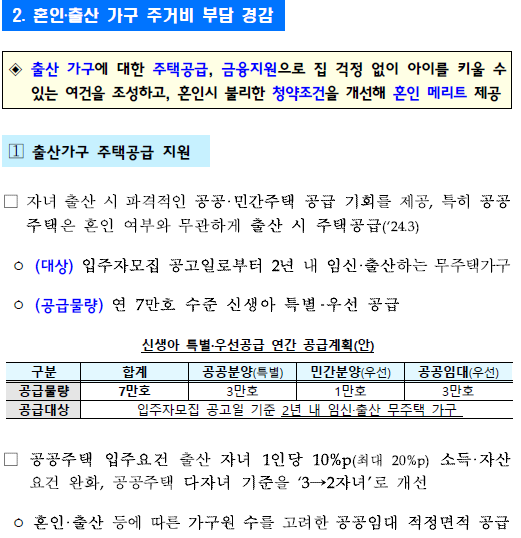 출산가구 주택공급 지원으로 핵심내용입니다.