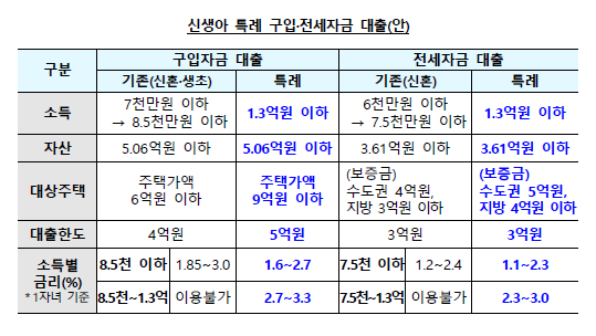 기존 대비 소득요건 2배 상향 (구입자금 예시 : 7천만원 -> 1.3억원)