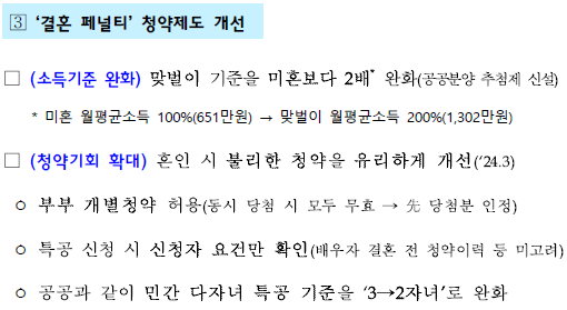 혼인 여부와 무관하게 출산 시 주택을 공급하도록 변경 저출산을 극복하려는 노력이 조금 보이네요.