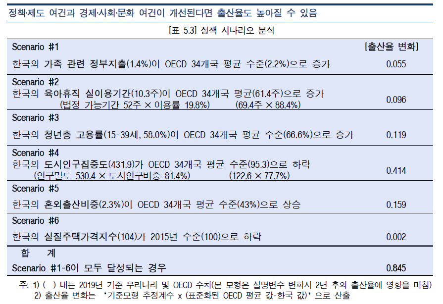 혼인 외 출생아 비중(2.3%)이 OECD 34개국 평균 수준(43.0%)으로 상승하는 경우, 추정결과는 출산율이 0.16명 상승할 수 있음을 암시한다(Scenario #5). 많은 유럽 국가에서 혼인외 출생아 비중이 상승하면서 출산율도 동시에 상승하는 경험을 하였는데, 이것이 추정결과에 반영된 것으로 보인다. 유럽국가들의 경우 비혼 동거 문화가 보편화되고 혼인외 출생아에 대해서도 차별 없는 지원을 제공하면서, 혼인외 출생아 비중이 매우 높다. 2019년 기준 OECD 34개국 평균 43%이며 프랑스는 61%, 아이슬란드는 69.4%에 이른다. 한편 우리나라에서도 결혼을 하지 않더라도 자녀를 가질 수 있다고 생각하는 청년의 비중이 증가하고 있다 (19-34세 청년의 비혼출산 동의 비중: 2012년 29.8%, 2022년 39.6%; 통계청). 또한 우리나라에서도 혼인외 출생아 비중이 미약하게나마 상승 중이다(21년 2.9%→22년 3.9%). 이러한 여건 변화에 맞추어 지원체계를 정비해 가야겠다.