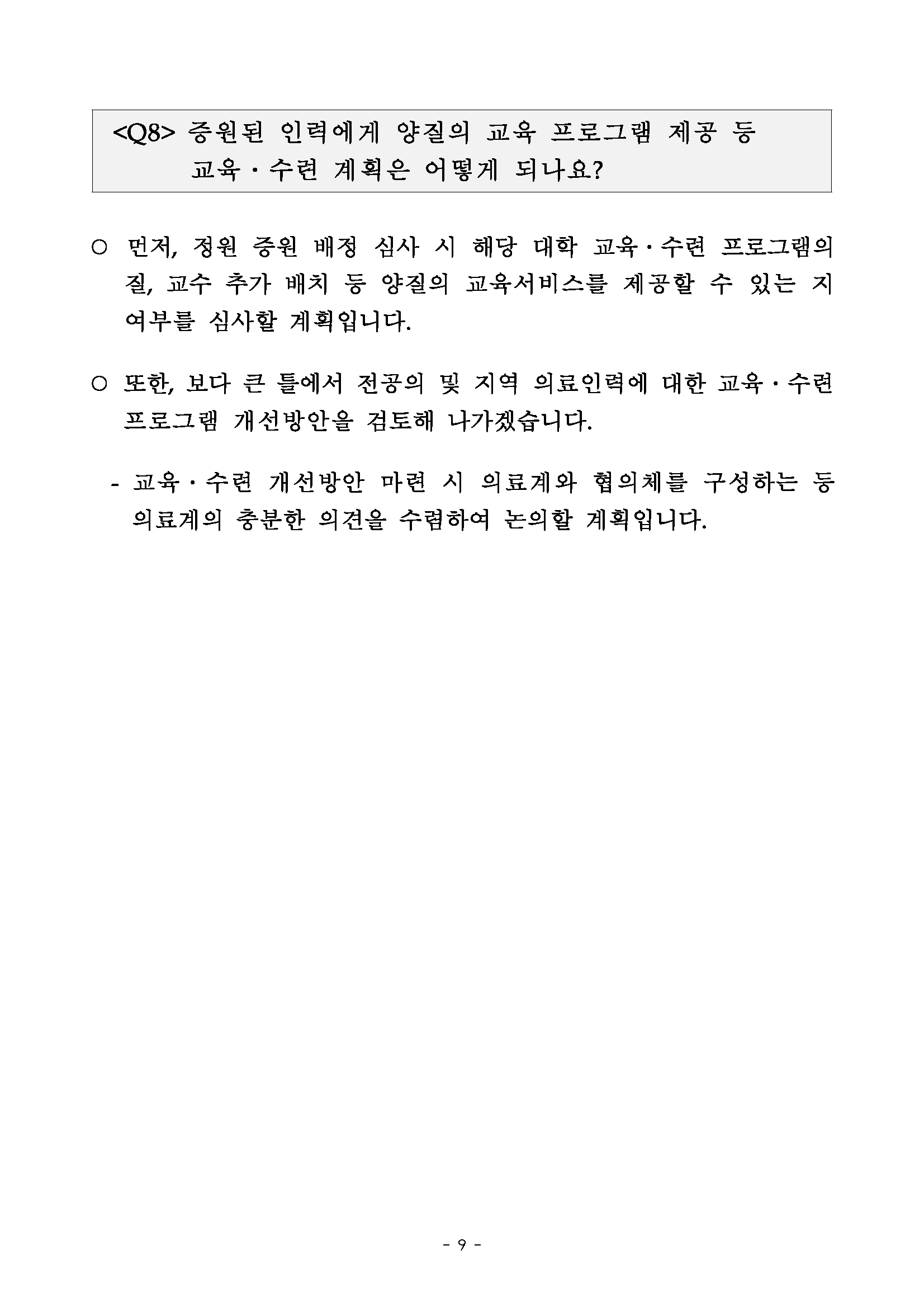 증원에 따른 교육프로그램 및 수련계획은 앞으로 준비한다고 하고 의료계와 협의해야할 사항이 산넘어 산이기 때문에 발표만 했을뿐 실질적으로 잘 실행이 될지는 지켜봐야 할 것 같습니다.