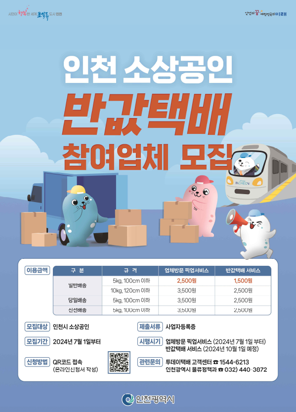 인천광역시가 소상공인의 물류경쟁력 강화를 위해 전국 최초로 추진 중인「소상공인 반값택배 지원사업」의 참여업체를 모집한다고 합니다. 인천시는 제1회 시 추경을 통해 30억 원의 사업비를 확보하고 「소상 공인 반값택배 지원사업」을 본격 시행한다고 밝혔습니다.