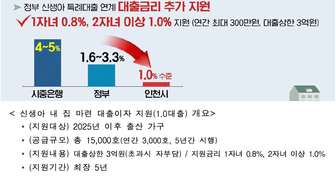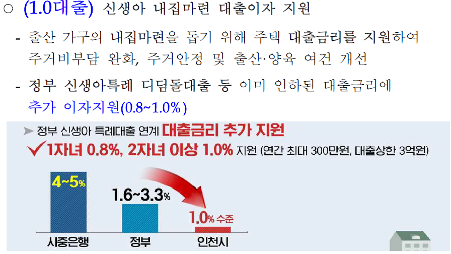 자녀를 출산한 가구의 내 집 마련을 돕기 위한 ‘신생아 내 집 마련 대출이자 지원(1.0대출)’도 추진한다. 이 사업은 정부가 지원하는 신생아특례디딤돌대출(최대금리 3.3%, 최저금리 1.6%) 등 이미 인하된 금리에 인천시가 추가로 이자를 지원해 주는 것으로, 출산 가구의 내 집 마련의 꿈을 이루고, 안정적으로 주택을 마련해 자녀 출산 및 양육 여건 을 개선하기 위한 것이다.