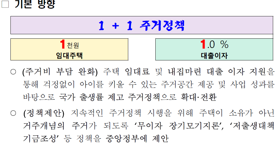 1+1 주거정책 … 1̌천 원 주택, 주택담보대출이자 1̌.0% 지원해 저출생 대응