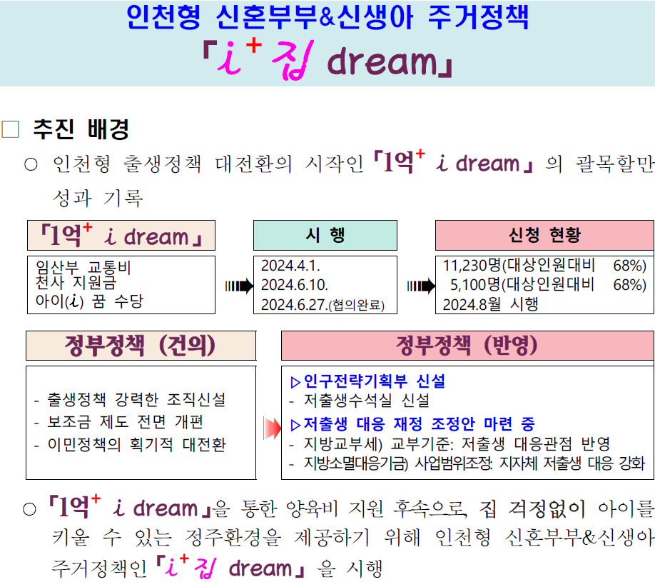 앞서 지난해 12월 인천에서 태어나는 모든 아이에게 1억 원을 지원하는 ‘1억 플러스 아이드림’사업을 발표하며, 다른 지방자치단체는 물론 정부와 정치권에 출생 정책의 대전환을 이끌어 온 인천시는 ‘1억 플러스 아이드림’의 후속으로 젊은 부부들의 주거문제를 해결하기 위한 ‘1+1 주거정책’인 ‘아이 플러스 집 드림’( i+집 dream)을 발표했다.