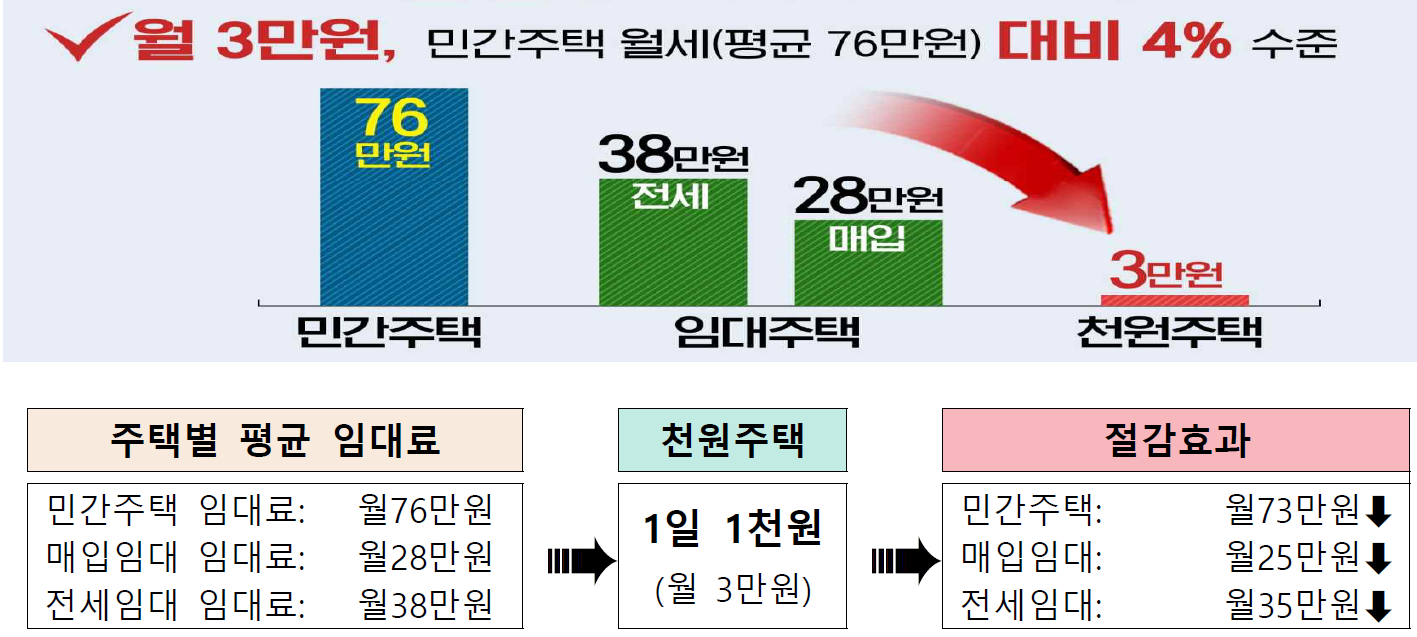 결혼한 지 7년 이내의 신혼부부 또는 예비신혼부부에게 최초 2년, 최대 6년까지 지원하며, 연간 1,000호를 공급할 계획이다. 천원주택은 민간주택 평균 월 임대료인 76만 원의 4% 수준으로 거주 할 수 있어 주거비를 획기적으로 줄일 수 있으며, 자녀 출산 및 양육에 큰 보탬이 될 것으로 보인다.