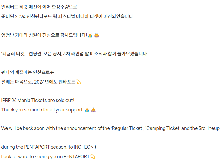 앞으로 남은 레귤러 티켓과 캠핑권 오픈 공지를 통해 예매가 가능한 것으로 안내되고 있습니다.