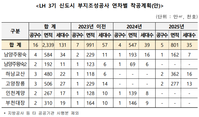 LH는 연내 3기신도시 내 인천계양 등 5개 지구에서 총 1만 호 주택을 착공해 오는 ’26년부터 최초 입주가 가능하도록 신속히 사업을 추진해 나갈 계획이다.