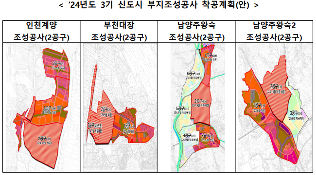 지난 5월 LH는 총 1.4천억 원 규모인 인천계양 2공구(139만㎡, 752 억원)와 부천대장 2공구(145만㎡, 605억원) 착공을 완료하고 본격적인 부지조성에 들어갔다. □ 하반기에는 총 1.8천억 원 규모로 남양주왕숙 2공구(192만㎡, 1,267억 원)와 남양주왕숙2 2공구(70만㎡, 556억원) 조성공사를 추진한다.