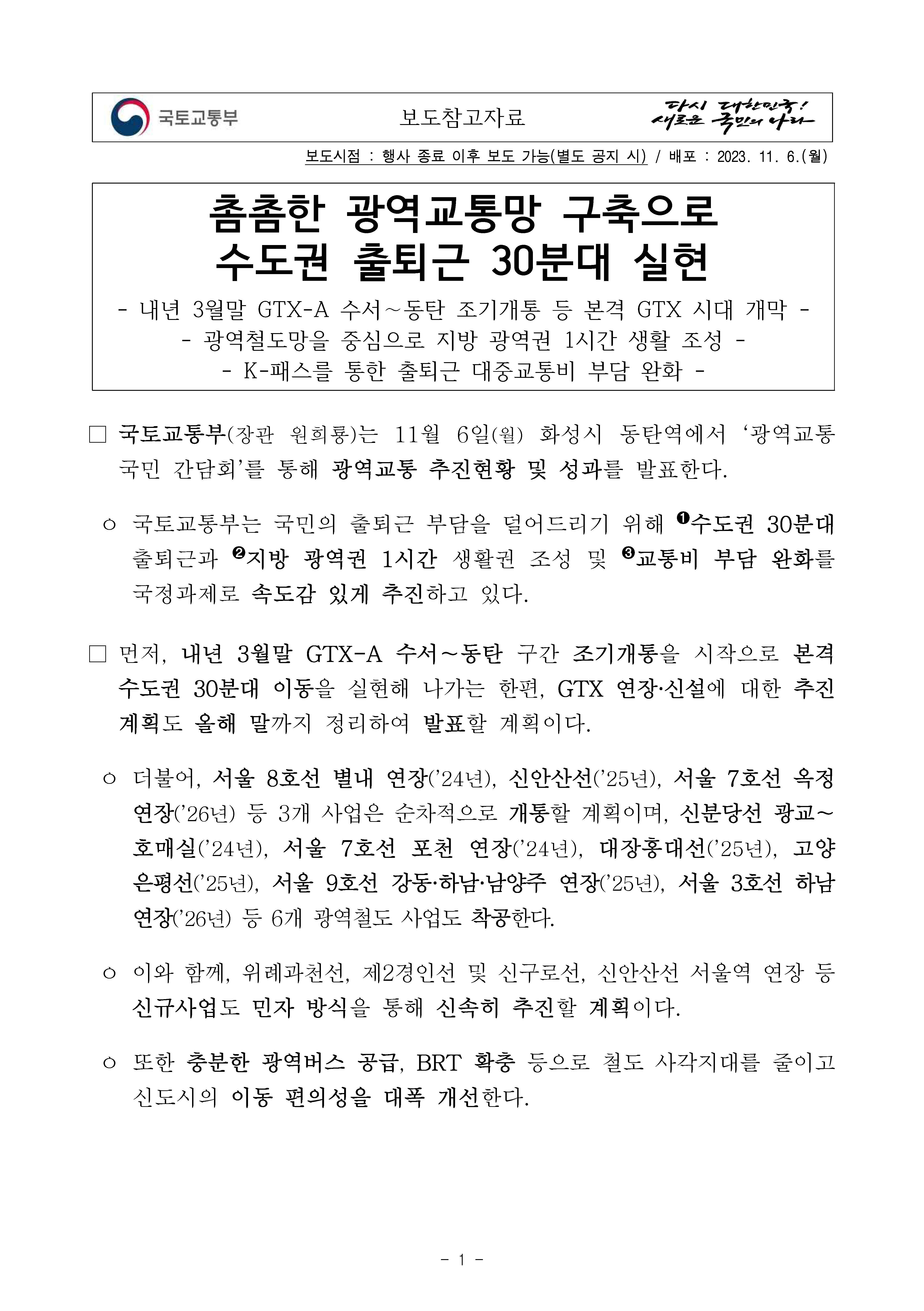 국토교통부에서 자료를 찾다가 11월 06일 보도자료에서 GTX 연장 및 신설 그리고